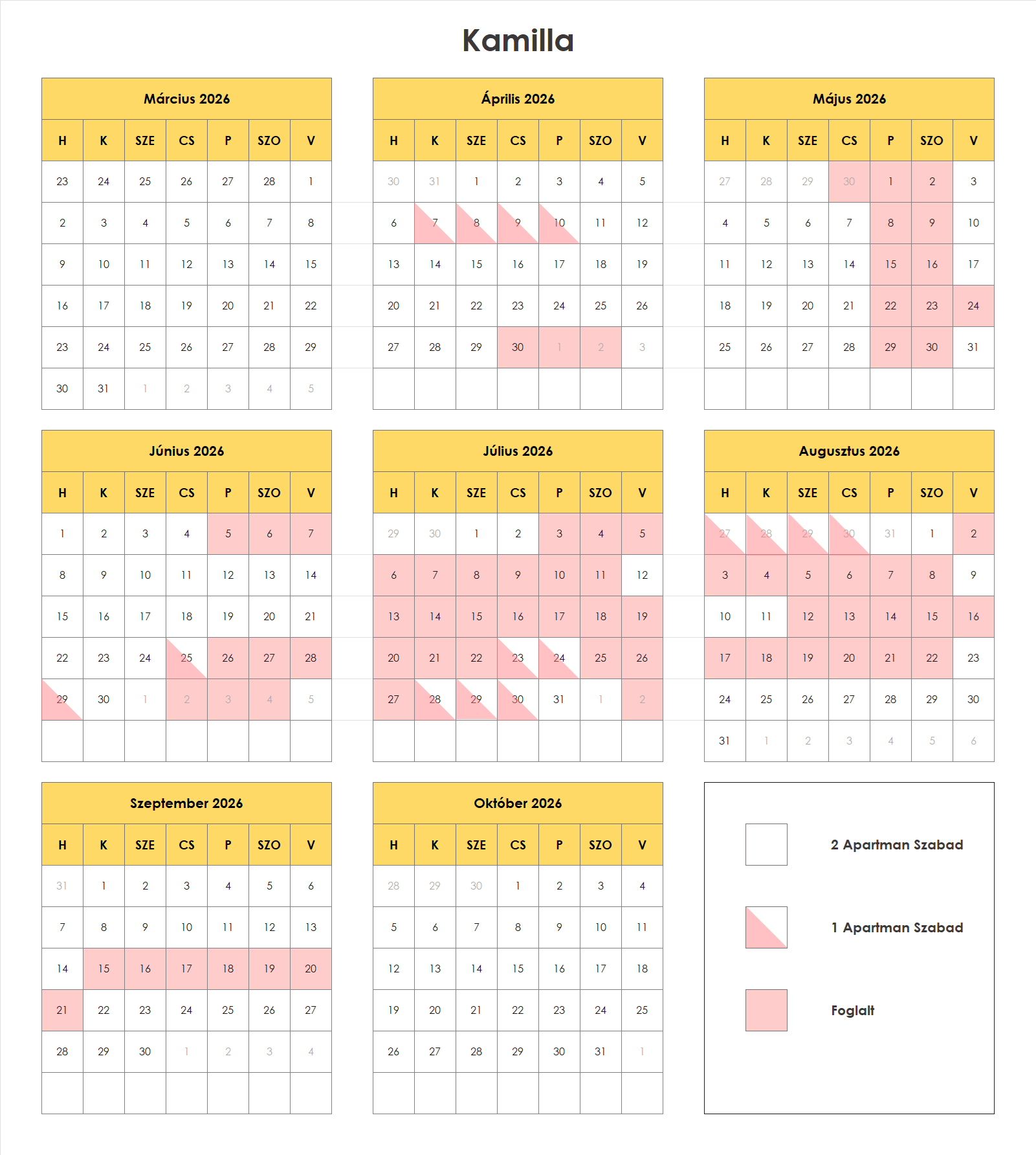 A Kamilla vendégház 2 db. 54 négyzetméteres 4 – 4 fő kényelmes elhelyezésére alkalmas apartmanból áll. A két apartmant egy tágas közös terasz köti össze, ami igény esetén elválasztható.